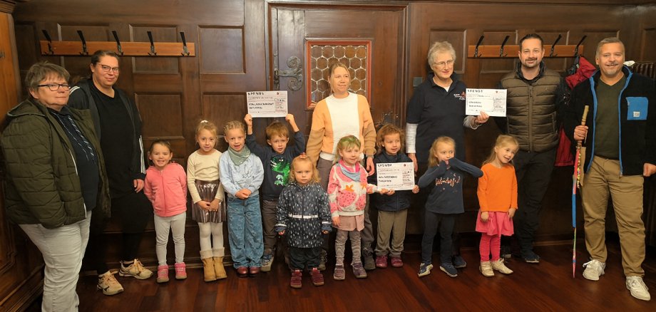 Als kleines Dankeschön überreichten die Kinder der Kita Am Schlossberg einen selbst dekorierten Wanderstock und erhielten im Gegenzug leckere Gummibärchen.